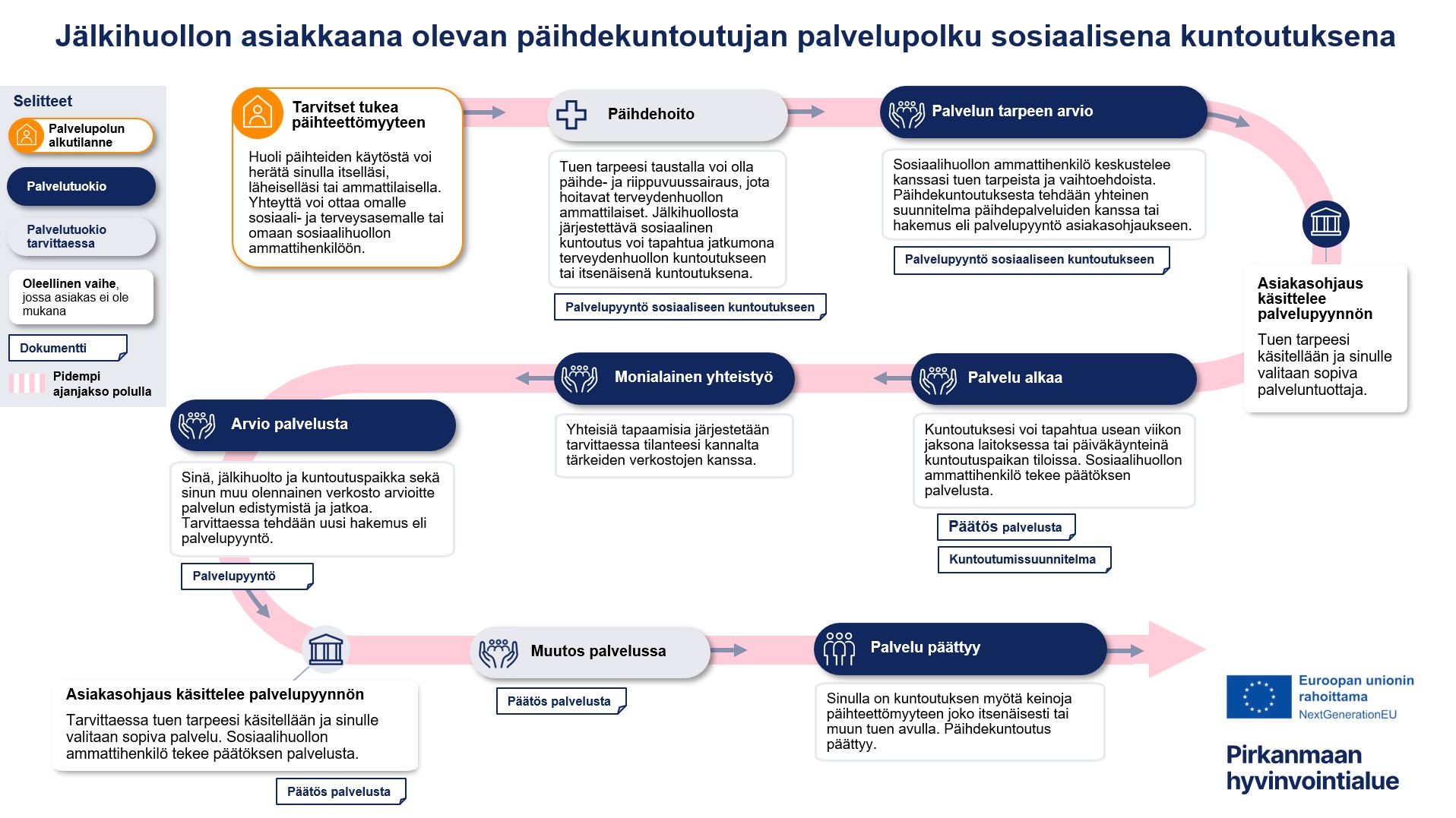 Tämä palvelupolku on tarkoitettu 18–22-vuotiaille asiakkaille, jotka ovat oikeutettuja Pirkanmaan hyvinvointialueen jälkihuollon palveluihin.