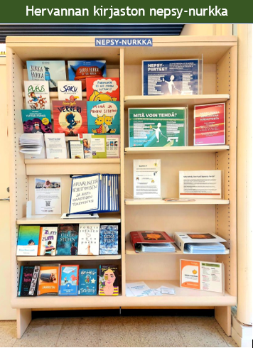 Urjalan kirjastossa toimii nepsy-nurkka, josta voi lainata apuvälineitä ja osaan apuvälineistä voi tutustua paikan päällä. Nepsy-aiheisia lasten kirjoja on esillä ja lainattavissa. Lisäksi esillä on tietoiskuja nepsy-asioista sekä myös jaettavia esitteitä.