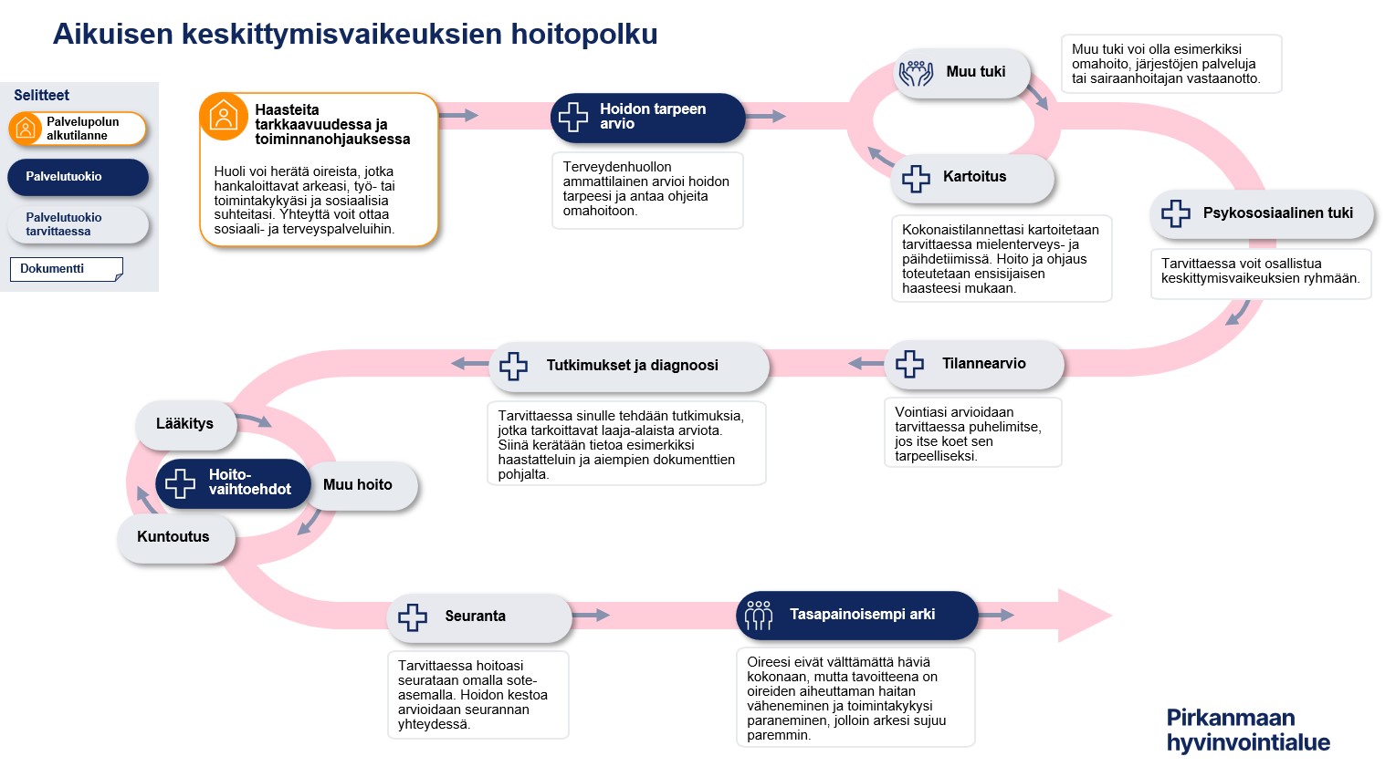 Tämä tutkimus- ja hoitopolku on tarkoitettu yli 18-vuotiaille pirkanmaalaisille, joilla on vaikeuksia keskittymisessä, tarkkaavaisuudessa tai toiminnan ohjauksessa. Nämä vaikeudet voivat haitata arkea, työtä tai ihmissuhteita.
