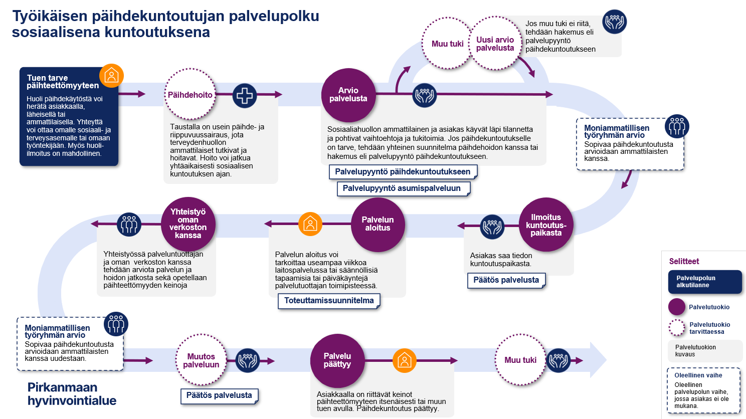 Palvelupolku kuvaa yli 18-vuotiaan asiakkaan päihdekuntoutusta sosiaalisena kuntoutuksena. Palvelun tarkoituksena on tukea asiakkaan päihteettömyyttä, vahvistaa henkilön kykyä selviytyä arkipäivän toiminnoista ja ihmissuhteistaan.