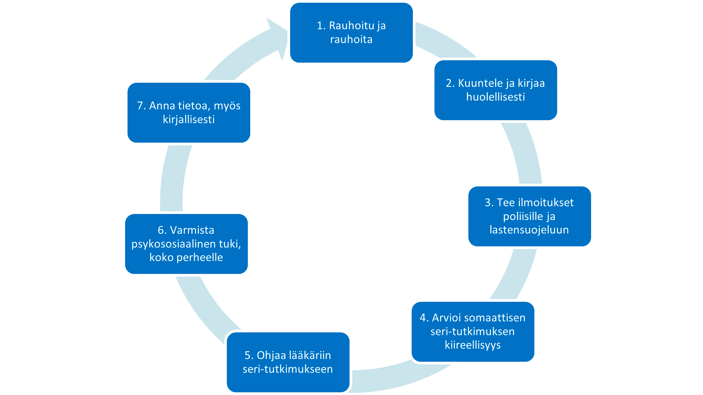 Katso myös tarkemmat ohjeet lapsen kohtaamisesta ja keskustelemisesta: Kun huoli herää - Tunnistaminen, puheeksiotto ja ohje kohtaamiseen, alle 18-vuotiaat