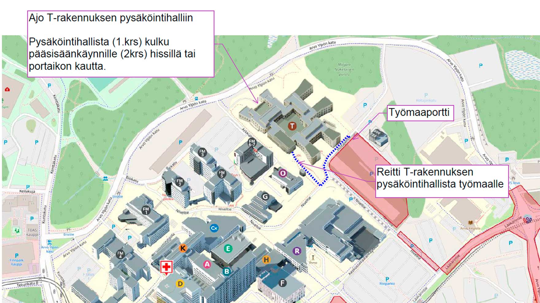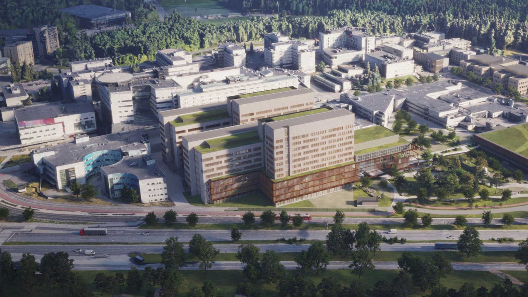 Sisäänkäynti Finn-Medi 5 -rakennukseen sijaitsee potilashotellia vastapäätä.