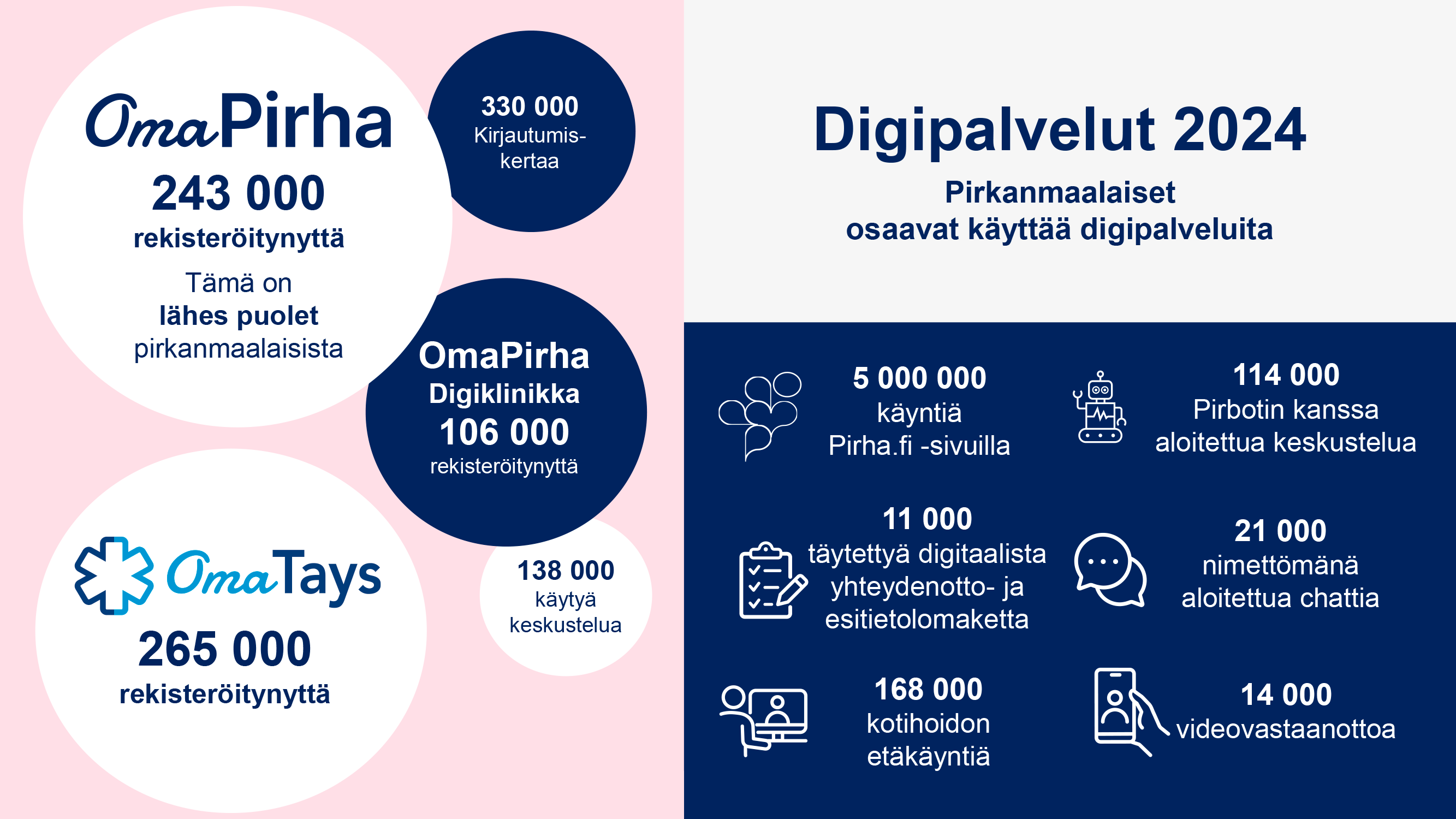 Myös OmaPirha Digiklinikka on otettu lämpimästi vastaan sen avauduttua toukokuussa 2024. Digiklinikalle on rekisteröitynyt yli 106 000 käyttäjää, ja sinne otettiin viime vuonna yhteyttä keskimäärin 17 000 kertaa kuukaudessa. Hoitajat ja lääkärit ratkaisivat 60 % yhteydenotoista jo digiklinikalla, ja lopuissa asiakkaan oman sosiaali- ja terveysaseman ammattilaiset jatkoivat hoitoa.
