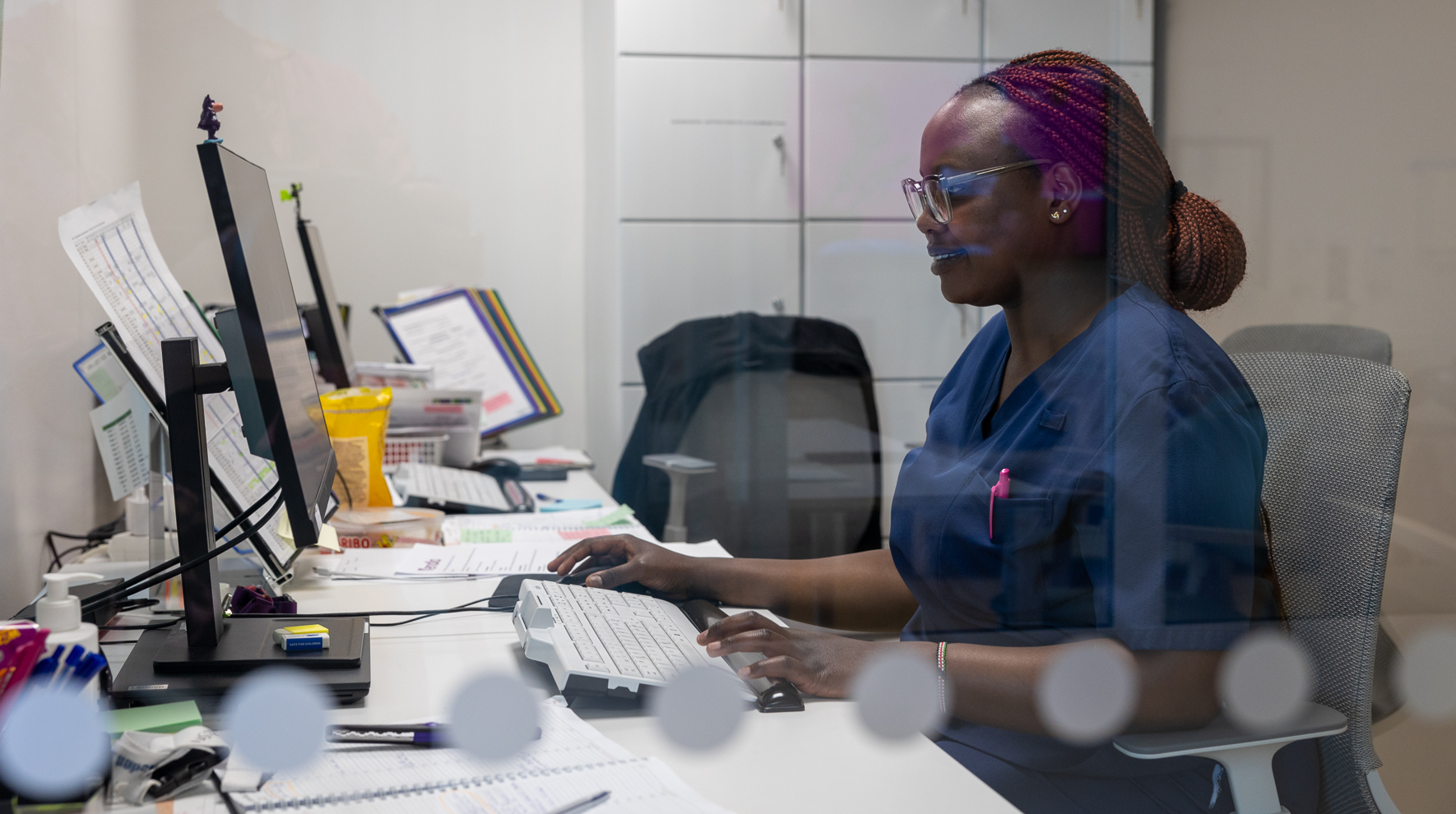 Sharonin työhön kuuluu asiakaskohtaamisia ja hoitotyön kirjaamista.